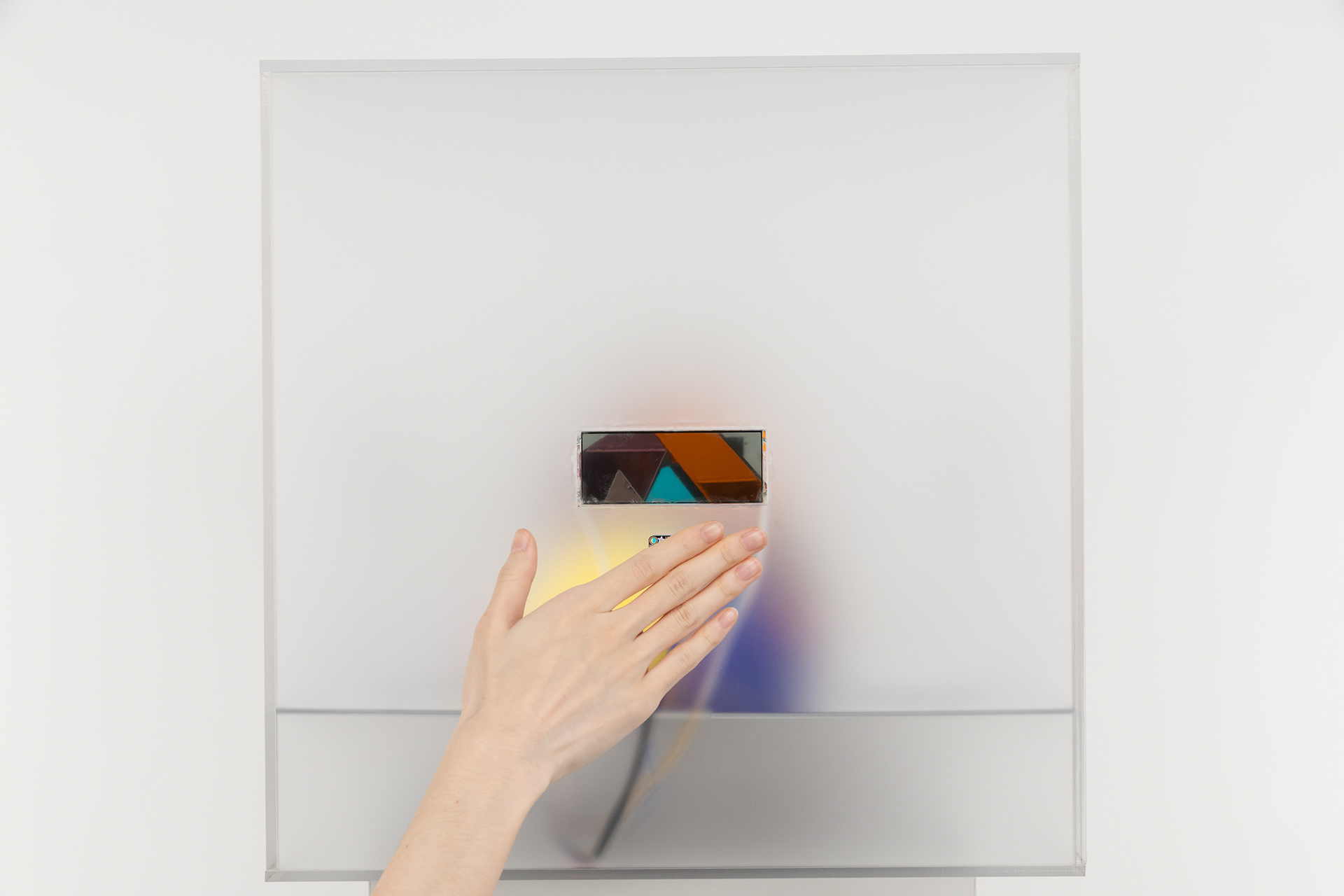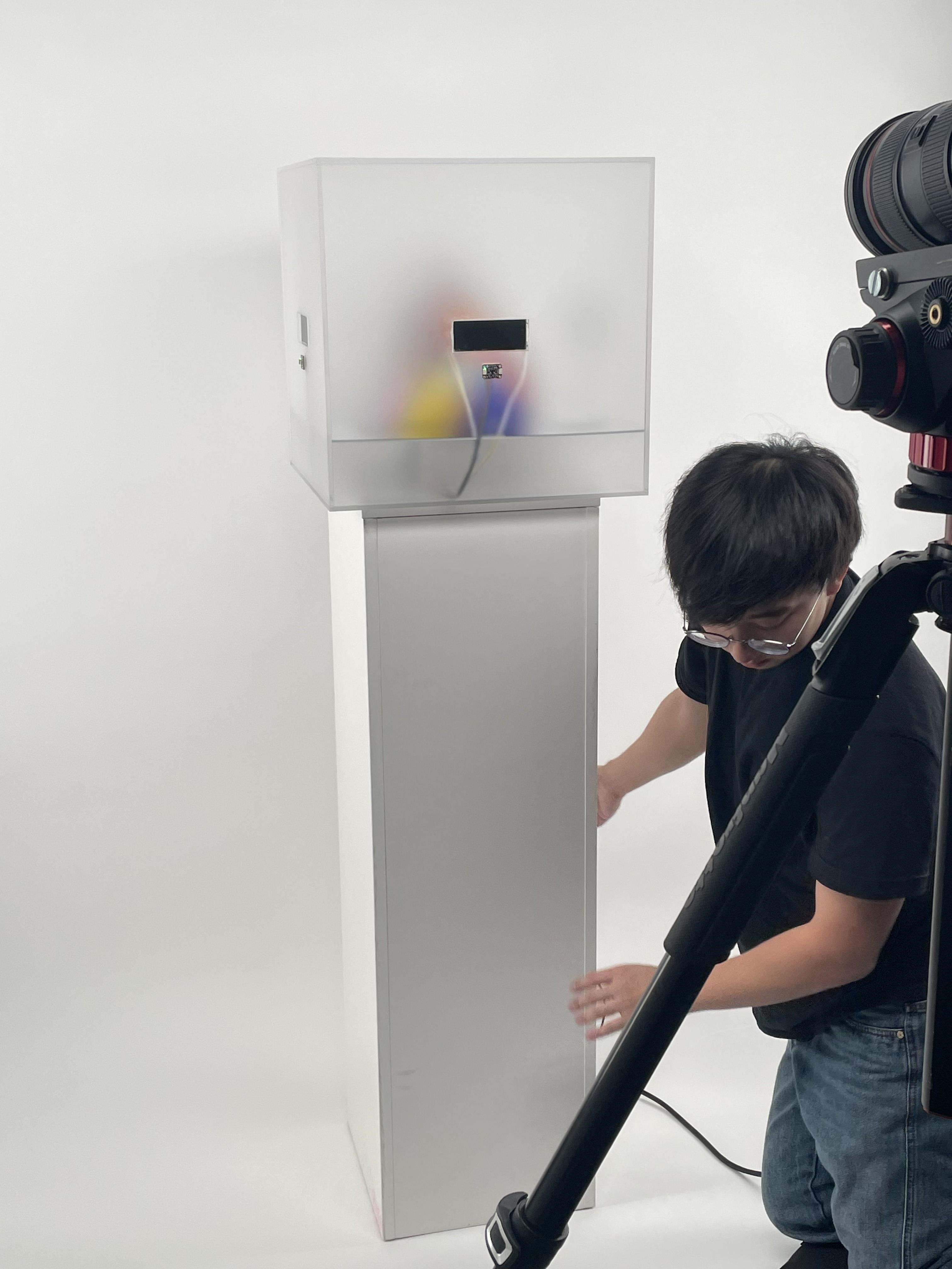 It uses a single Arduino Uno microcontroller and a TCA9548A I2C Multiplexer to obtain distance values from four Adafruit VL53L0X Time-of-Flight Distance Sensors. Based on these readings, four shutter glasses transition from opaque to transparent. Positioned at the center of the acrylic box is a sculpture crafted from vibrant mirror pieces.